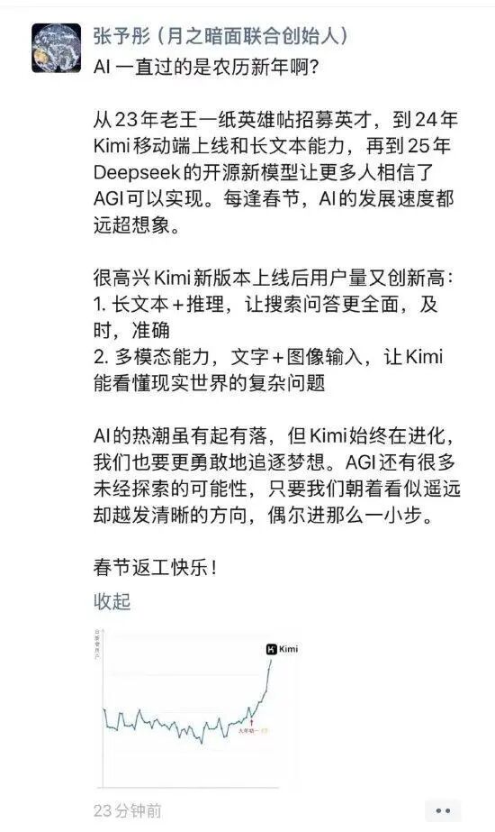 2月10日凌晨消息,“AI一直过的是农历新年啊?”月之暗面联合创始人张予彤发文称,每逢春节,AI的发展速度都远超想象。她表示,AI的热潮虽有起有落,但Kimi始终在进化,我们也要更勇敢地追逐梦想。AGI还有很多未经探索的可能性,只要我们朝着看似遥远却越发清晰的方向,偶尔进那么一小步。GHo拜客生活常识网