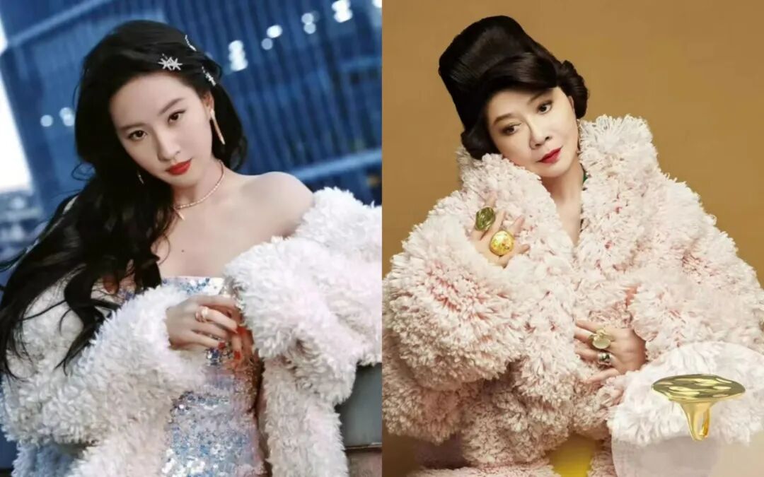 看似外观差不多的服饰,穿在蔡明和刘亦菲的身上却是迥然不同的感觉。一个华贵艳丽,一个清纯知性,真是各有各的美。蔡明的发型也是相当有特色,一头乌黑的长发被梳成了颇具古典韵味的盘发,看着很像是一位雍容华贵的贵妇。她的手上还戴着几颗华丽的钻戒,那种贵妇气质就更加凸显出来了。她脸上的妆容也非常精致,那道红唇显得十分复古迷人,为她增加了一丝冷艳感。这样的蔡明,就好像画报中的古色古香美人,自带一种庄重典雅的美感。