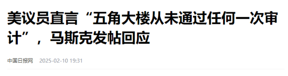 在上任之前,特朗普至少4次在演讲中说,对于国防建设,他要干两件大事。一个是组建太空国民警卫队,以完善太空军的组织体系。特朗普说:美国对地外空间的探索事关国家安全,现在在太空中仅有存在感是不够的,还要具有统治力,建立太空军对于维护美国的国家安全而言至关重要。而另一个是建立超级防空体系,一个远比以色列更为强大的铁穹系统。特朗普说:我们将在全国各地建立一个伟大的铁穹导弹防御系统。里根多年前就想这么做,可当时我们没有技术,现在不一样了!这两个都是超级大项目,加起来需要至少5000亿美元,但现在特朗普暂时不提这两个事了。一是没钱干,特朗普每年拨出去6万亿美元,但联邦政府财政收入只有大约4万亿美元,每年净亏损2万亿,为了填窟窿就要靠发行美债度日,哪里还有钱去搞什么大项目。二是干不了,就算特朗普搞到了5000亿美元,拨给国防部去打造超级铁穹体系,接下来就有意思了。如果五角大楼有良心的话,5000亿美元他们贪污掉4000亿,剩下的1000亿拿去做项目。但他们不可能这么干,正常情况下他们要搞走4800亿,剩下的钱装个在做项目的样子,等特朗普离任的时候,屁都没搞出来。相当于特朗普白忙活一场,给五角大楼的人送了一笔巨款。在特朗普指示马斯克去调查美国军方后,马斯克随后就在社交平台上引用了美国议员伯切特的话:五角大楼从来没有通过过任何审计!伯切特原文说的是:五角大楼多年来从来没能通过审计,他们完全无法解释8240多亿美元预算的支出状况。