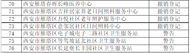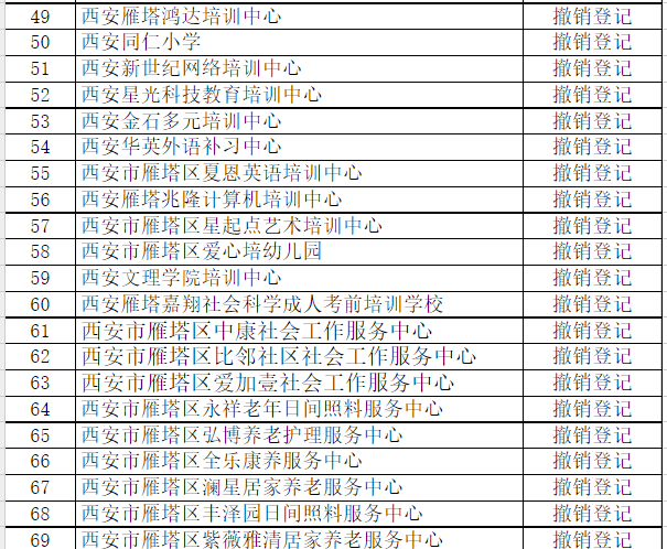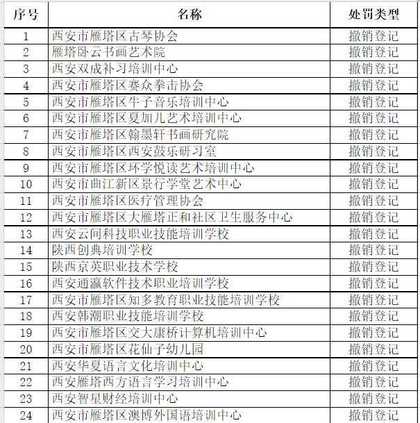 经核查,下列76家社会团体和民办非企业单位连续两年未参加年检,分别违反了《社会团体登记管理条例》第二十八条的规定和《民办非企业单位登记管理暂行条例》第二十三条规定。依据《社会团体登记管理条例》第三十条规定、《民办非企业单位登记管理暂行条例》第二十五条规定及《民办非企业单位年度检查办法》和《民政部关于开展“僵尸型”社会组织专项整治行动的通知》要求,以下机构违反了行政管理秩序,根据情节严重程度,西安市雁塔区民政局对这76家社会组织分别予以撤销登记和警告的处罚。现就处罚社会组织名单予以公示。