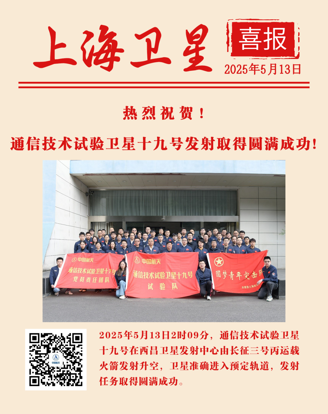 本次发射的通信技术试验卫星十九号是八院应用卫星领域2025年度发射的第8颗卫星,也是上海卫星工程研究所作为卫星总体参与研制并发射的第154颗卫星。卫星主要用于开展多频段、高速率卫星通信技术验证。