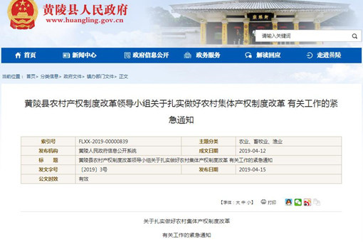 2019年4月12日,陕西省延安市《黄陵县农村集体产权制度改革领导小组办公室关于扎实做好农村集体产权制度改革有关工作的紧急通知》发布,以下是文件内容全文。