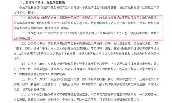 1、跨省旅游经济活动不再与风险区实施联动管理。跨省游客需凭48小时内核酸检查阴性证明乘坐跨省交通工具。跨省流动人员开展“落地检”要求,积极引导游客主动进行核酸检测。